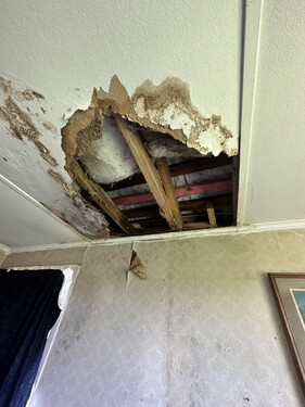 In early July, 2023, in the middle of the day with her great-grandson in the house, her living room ceiling collapsed. Thankfully the little boy wasn’t in the room when it caved in.